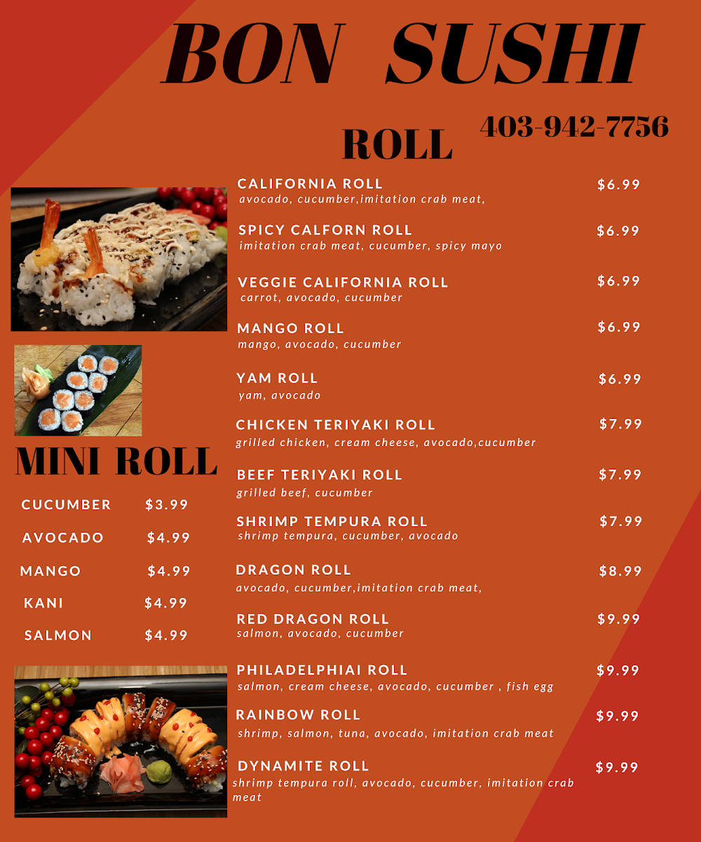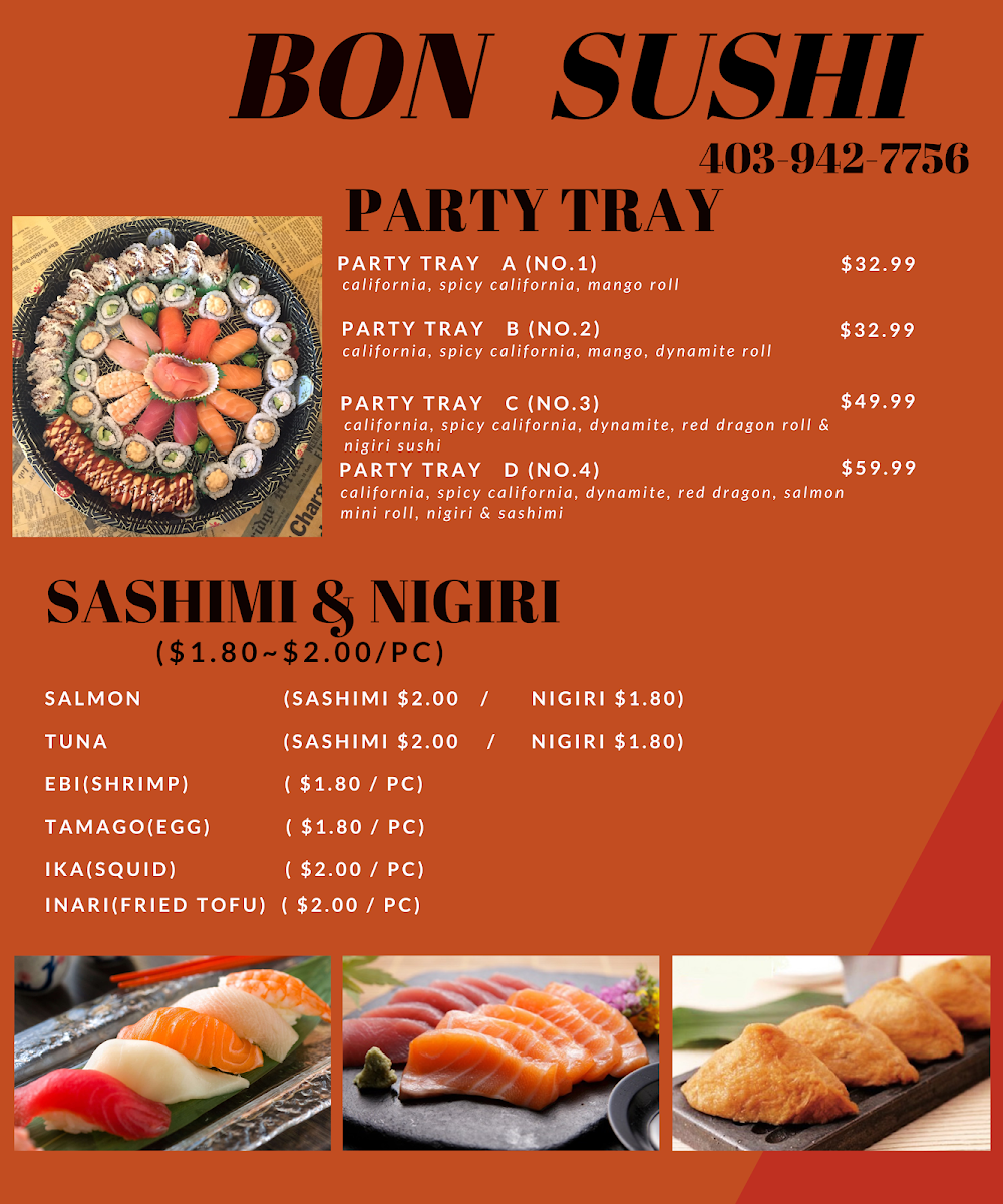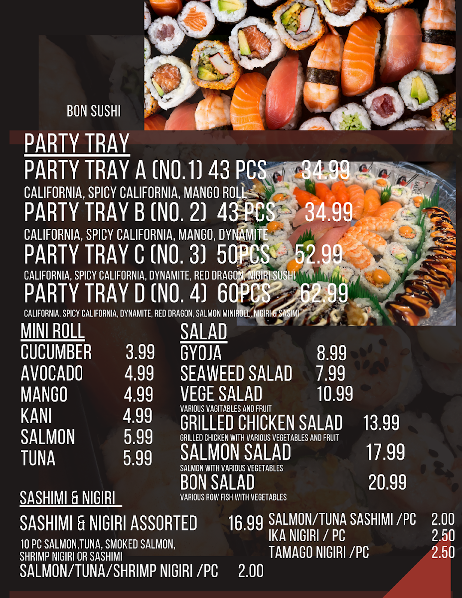 ................................CA$62.99California Roll, Spicy California Roll, Dynamite Roll, Red Dragon roll, Salmon Mini Roll, Nigiri Sushi, Sashimi