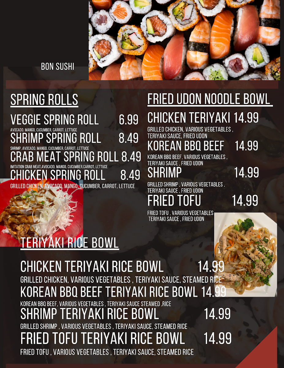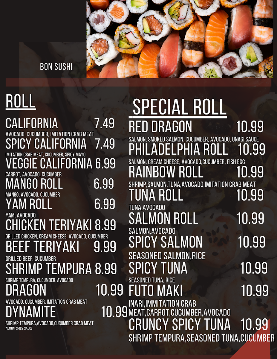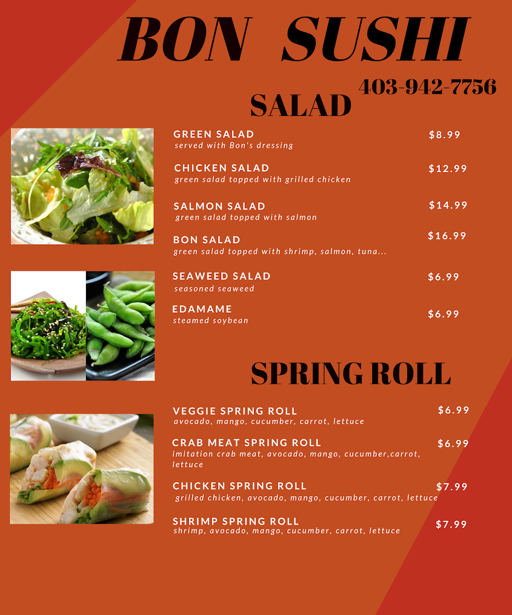 ................................CA$62.99California Roll, Spicy California Roll, Dynamite Roll, Red Dragon roll, Salmon Mini Roll, Nigiri Sushi, Sashimi
